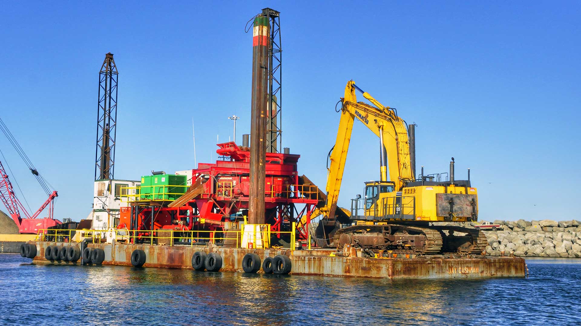 From here, the Sam M. push boat brought the dredge to meet the Foss deck barge in Morgan City. In Morgan City, we hired a large crane to lift the Jay Cashman dredge, the PC 1250 excavator, and the Sam M. push boat onto the Foss deck barge. About a month later, the entire package arrived in Seattle.