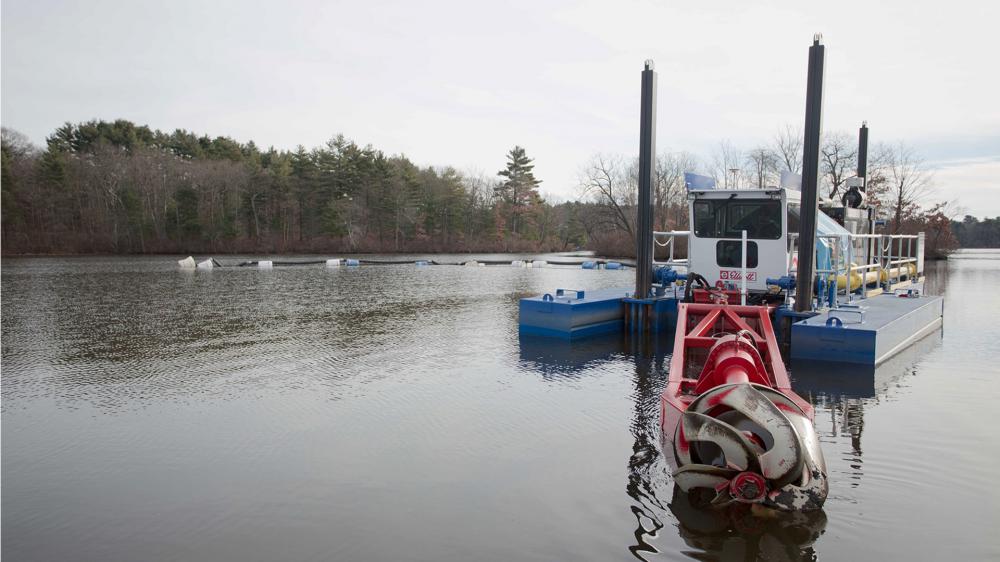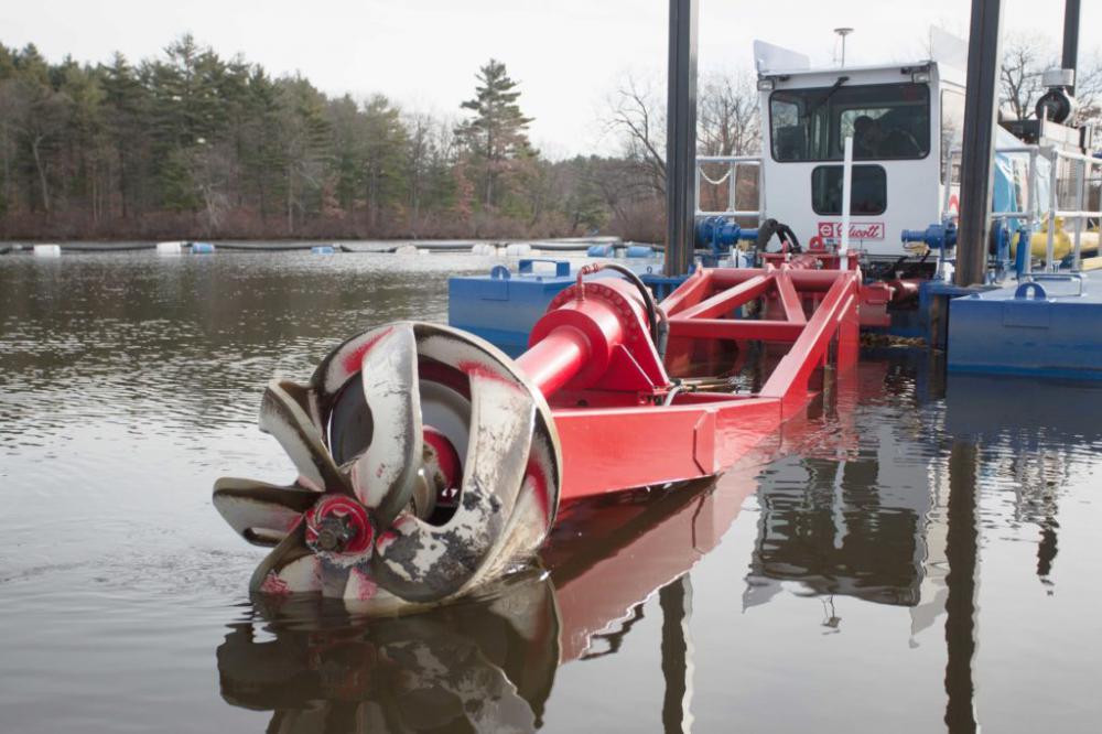 - CASHMAN initially conducted hydraulic dredging to remove sediment material, which was then pumped and drained at the Town Beach, where clean material was used to settle in large Geotubes® through mid-April 2013, and then hauled off-site, and clean water was pumped back into the pond.