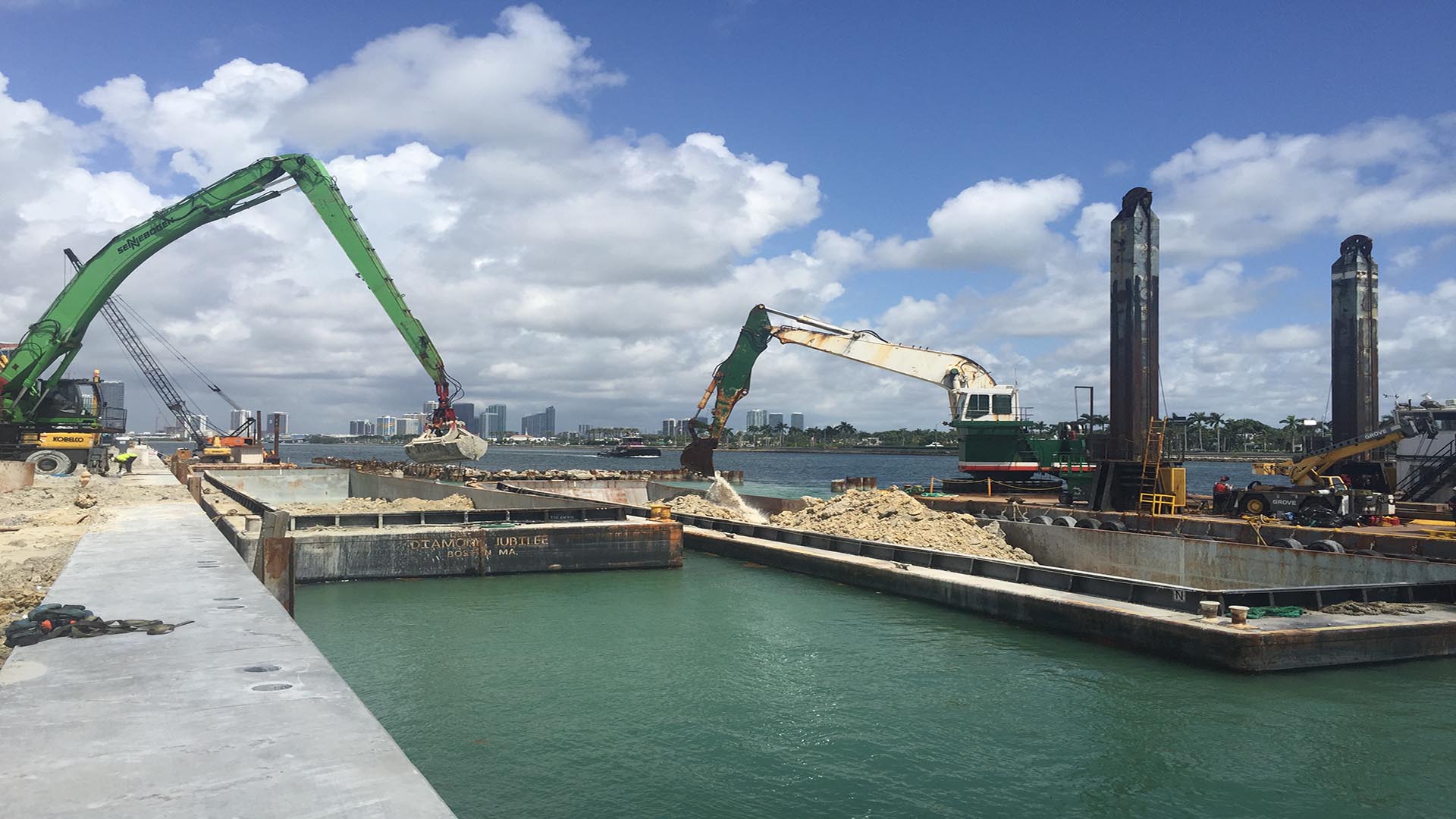 - Cashman’s responsibilities included dredging ~117,000 yd3 of sand, coral, debris, and limestone into fixed bottom hopper scows; trans-loading of that material from the scows on to land for re-handling and trucking offsite.