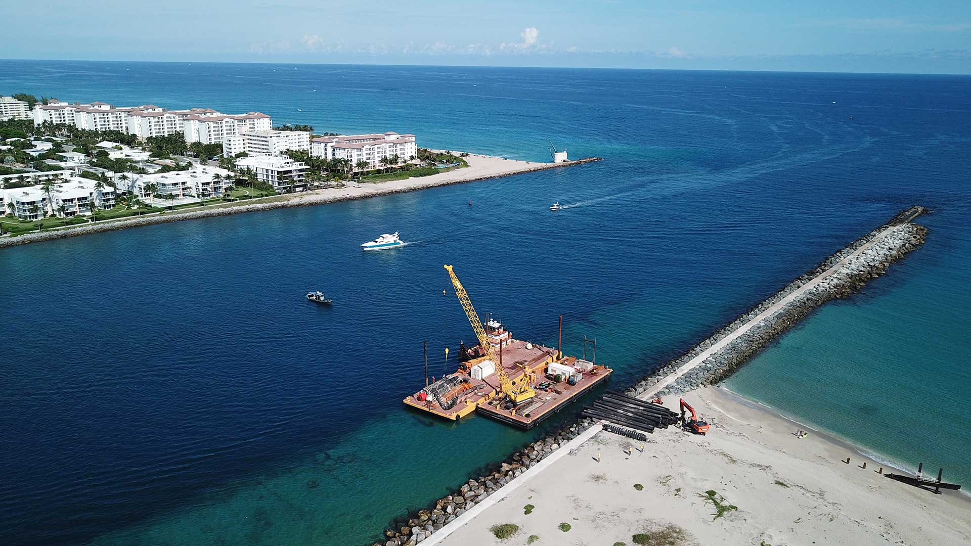 Cashman Dredging performed dredging work of the Lake Worth Inlet in West Palm Beach, FL. Prior to mobilizing for maintenance dredging of the channel, Cashman was requested by USACE Jacksonville District to complete emergency dredging of the channel using the Atchafalaya. During this time, the Atchafalaya was actively dredging the St. John’s River in Jacksonville, FL. The Atchafalaya temporarily suspended digging the St. John’s River and was mobilized to the Lake Worth Inlet in order to clear the channel to 33’ and dispose of the material in the Near-Shore Disposal Area just south of the inlet’s southern jetty.